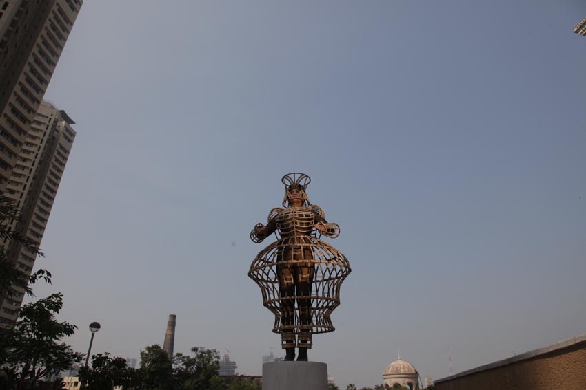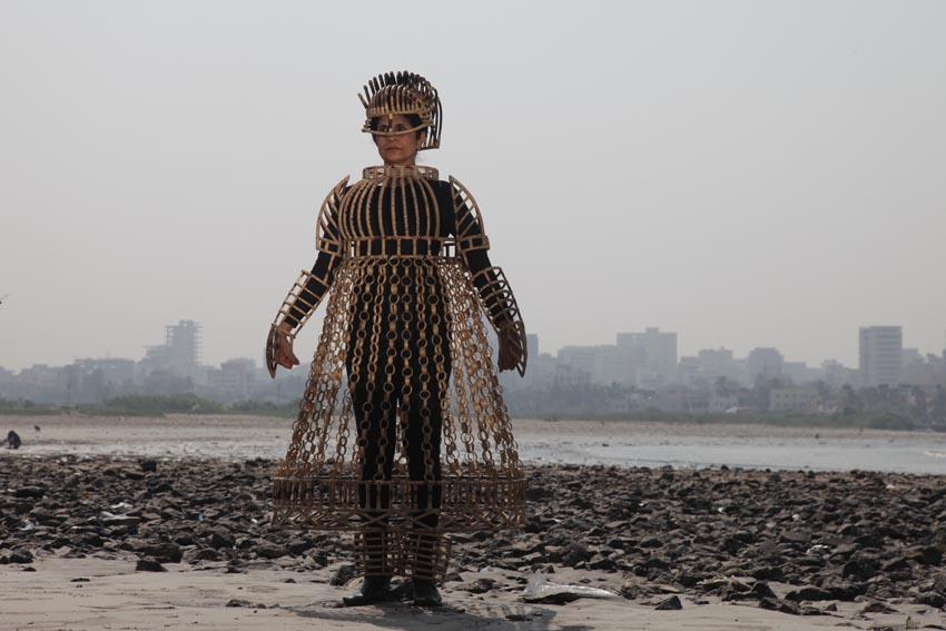*At an immediate level, Kulkarni’s ‘wearable sculptures’ demonstrate the individual agency of the female self, its ability to craft choices for itself within a hostile or indifferent social and political environment. ‘Of bodies, armour and cages’ constitutes a courageous experiment in public consciousness: it essays the critique of a public culture overinscribed by patriarchal norms and misogynist assumptions. In such a social, cultural and political context, ‘woman’ is a conscriptive, compulsory identity produced and maintained through the mechanisms of sanction, conditioning, socialisation, prescription and proscription. As the artist, writer and cultural activist ShuddhabrataSengupta wrote in ‘To the Young Women and Men of Delhi: Thinking about Rape from India Gate’, his post of 23 December 2012 on Kafila.org: “Let us think about patriarchy together. Patriarchy is what makes you ashamed, not delighted when you have a period, because your traditions teach you that a menstruating body is a polluting body. Patriarchy is what tells you that there are things you cannot or should not do because of the way your body or your desires are shaped. Patriarchy is the secret to your nightmares, the reason for your deepest, most personal fears and anxieties. It seeks control of your body, your mind, your speech, your behaviour, even the ways in which you raise and lower your eyes. Behind this lies a clear identification between property and the sexual body that patriarchy tries to perpetuate at any cost.” [1]