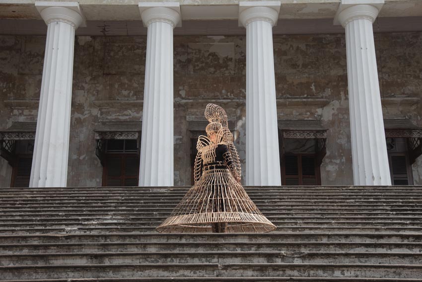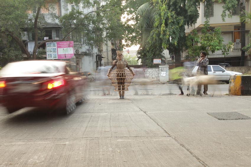 As we look at these photographs, we become privy to a startling transfiguration: the body itself becomes the studio, and we, as viewers, become participants in a theatre of disruption and remaking. Kulkarni’s combination of sculpture and performance invites us into a compelling space of interactive encounter, questioning, probing and recognition. Importantly, this is the point at which to observe that we refer to Kulkarni’s persona in performance as a female body only because we ascribe the artist’s being a woman to the roles she essays through this project. In actuality, the figure in the ‘wearable sculptures’ contravenes conventional gender ascriptions, transforms its apparatus of protection into a hyperbolic statement, dissolving the entrenched but facile dichotomies of male/ female, belligerent/ nurturing, assertive/ reticent. Indeed, Kulkarni’s deployment of hyperbole is a crucial and constitutive strategy: she deploys it to obstruct, break down, baffle the conscriptive codes of patriarchy. The act of wearing these suits of cane armour not only permits the artist to try on a variety of personae; it also imparts to her the force of a versatile presence that refuses to be neatly classified within prevailing definitions of age, gender or temporality.