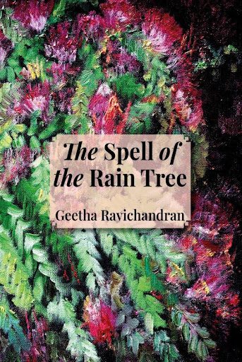 The Spell of the Rain Tree is an aural hike into rhizomatic trails brimming with chromatics of twilight. Geetha Ravichandran’s latest poetry collection when held in one’s hands, feels like an unopened gift. The sensory exuberance of its cover’s leafy brushwork by Uma Singh is a synesthetic invitation to pause, and to listen to the scarlet heartbeat of vibrant flowers peeking through dense shrubbery. These wild emissaries ensconced in their verdant nest hold up a translucent parchment emblazoned with the title in bold and cursive fonts. The animistic aura of this visual sets the mood for the fecund vernacular to follow. Wooded whispers drizzle on the by-lanes of memory, as throbbing absences populate the poems. These hover as a dimly lit backdrop to the neon buzz of a digital world, giving a palpable sense of time moving both ways at once.