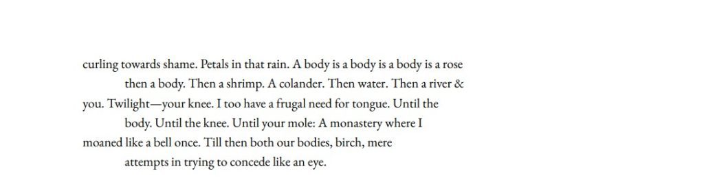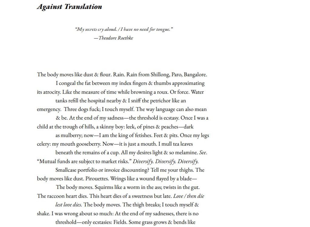 Smallcase portfolio or invoice discounting? Tell me your thighs. The body moves like dust. Pirouettes. Wrings like a wound ayed by a blade—