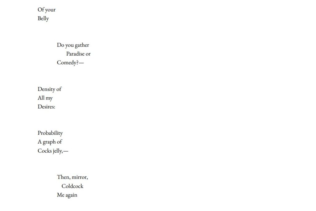 do we enter the world from behind without rupturing a life? The body naked—a circus of bones: Nakedness its only show, its enamel shield.
