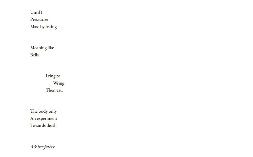 Until then a body. The body moves like dust. Like ower. Rains. The body moves like a canticle in verse: My own personal nomenclature of