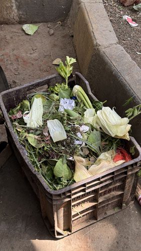 The residue of a vegetable stall even before they begin the day of selling. These parts of produce cannot even be given away for anyone to consume. They lie there, in the colourless crate full of the unusable bounty.