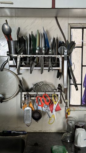 Inside the kitchen of a tiny Bandra apartment. The stove is stacked with steel-bhagonas of karela, dal and rice – one on top of the other, the only thing separating them is a steel plate. The shelf is designed to fit in everything the kitchen could hold.