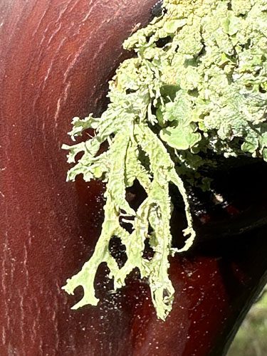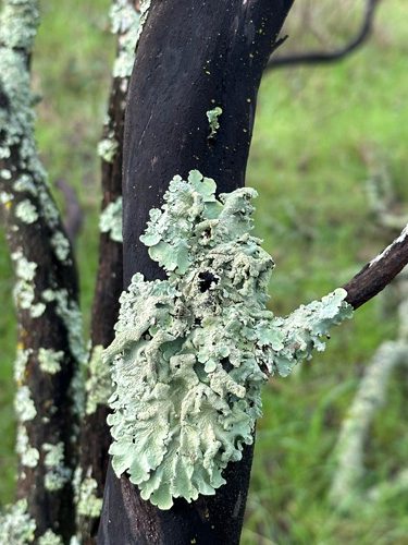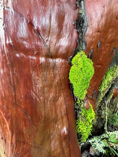 The numinous moss nestles in crevices of muscular manzanita trees,