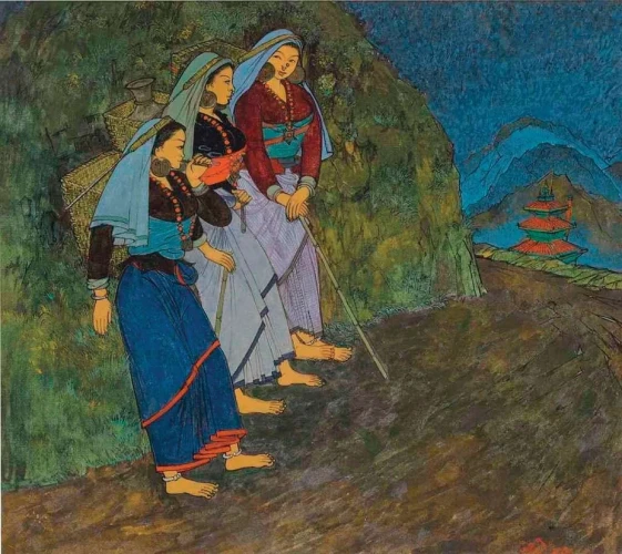 With wings in his feet, he sojourned through his life, painting in the punctuations. It is said that once when he had experienced a bus accident in Kashmir, he woke up in shock, and asked for his paints! In 1945, he was in Santiniketan where he met Nandalal Bose, Binode Bihari, Ramkinkar Baij, and K. G. Subramanyan-all of them along with camaraderie, helped shape his own way of approaching his canvas.