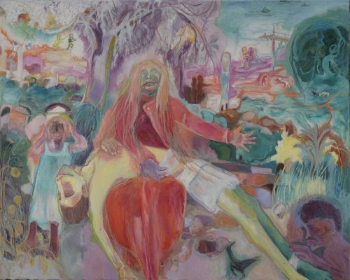 In contrast, Sosa Joseph approaches violence with the sensitivity of a storyteller: she doesn’t seek to represent or archive a traumatic history, nor does she romanticise the resilience of a victim or survivor. Here, our contradictory world – an eerie horror woven into the ordinary – emerges in luminous contours, striking both terror and wonder with a single note. In Joseph’s ominous painting, a wounded, distorted woman not only subverts the patriarchal gaze – but more importantly, she glares back, severely and unswervingly, into the very eye of her oppressor. Titled ‘Pieta’, her work refers to a popular visual trope: Mary holding the lifeless body of Jesus Christ, rendered with profound sorrow and tenderness, often evoking affects of pity or compassion. Joseph juxtaposes this symbolic imagery with the story of Bhoopathy, an Adivasi woman, whose son, Abhimanyu, a Left-wing student leader, was assassinated on campus by extremist forces in 2018. But Joseph’s protagonist doesn’t ask for your pity nor does she appeal for our empathy. As she holds her martyred son, Mary is enraged and her manic grief resounds with force, reverberating through the canvas. She demands absolute retribution in the present – no more or less – as her voice echoes upon the distant horizon yet to arrive, but if you look closer, a soft hint of dawn encircles this desolate field.