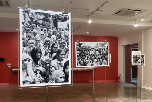 As you enter the gallery, the intricate – even permanent – relation between art, photography, politics, and activism becomes overwhelmingly apparent; Sheba Chhachhi’s archival black and white photographs (documenting protests across the country in the 1980s) are stationed deliberately in the midst of artworks, film, and sculptural objects. The piercing gaze of Satyarani Chadha and Shahjehan Begum Apa arrests each viewer, as both women are captured holding photographs of their daughters, Kanchanbala and Noorjehan, who died, succumbing to burns inflicted by their in-laws. In another photograph, Moloyashree Roy performs the street play Aurat, staged by Safdar Hashmi’s group, ‘Jan Natya Manch’, as a faint, even fervid intensity simmers within the frame. In this body of work, the artist also occupies the position of an activist: Chhachhi remains deeply committed to the cause as a founding member of ‘Jagori’, a womens’ group, along with Kamla Bhasin and Abha Bhaiya. But her photographs speak to a larger story. Hordes of women gather, and in their forceful collectivity, Chhachhi’s careful eye foregrounds a rare fragility – folded inside each outcry for justice. Their inflamed grief and rage turns palpable, now as visceral undercurrents into our own contemporary time, four decades later.