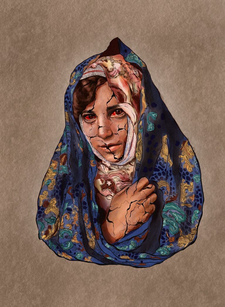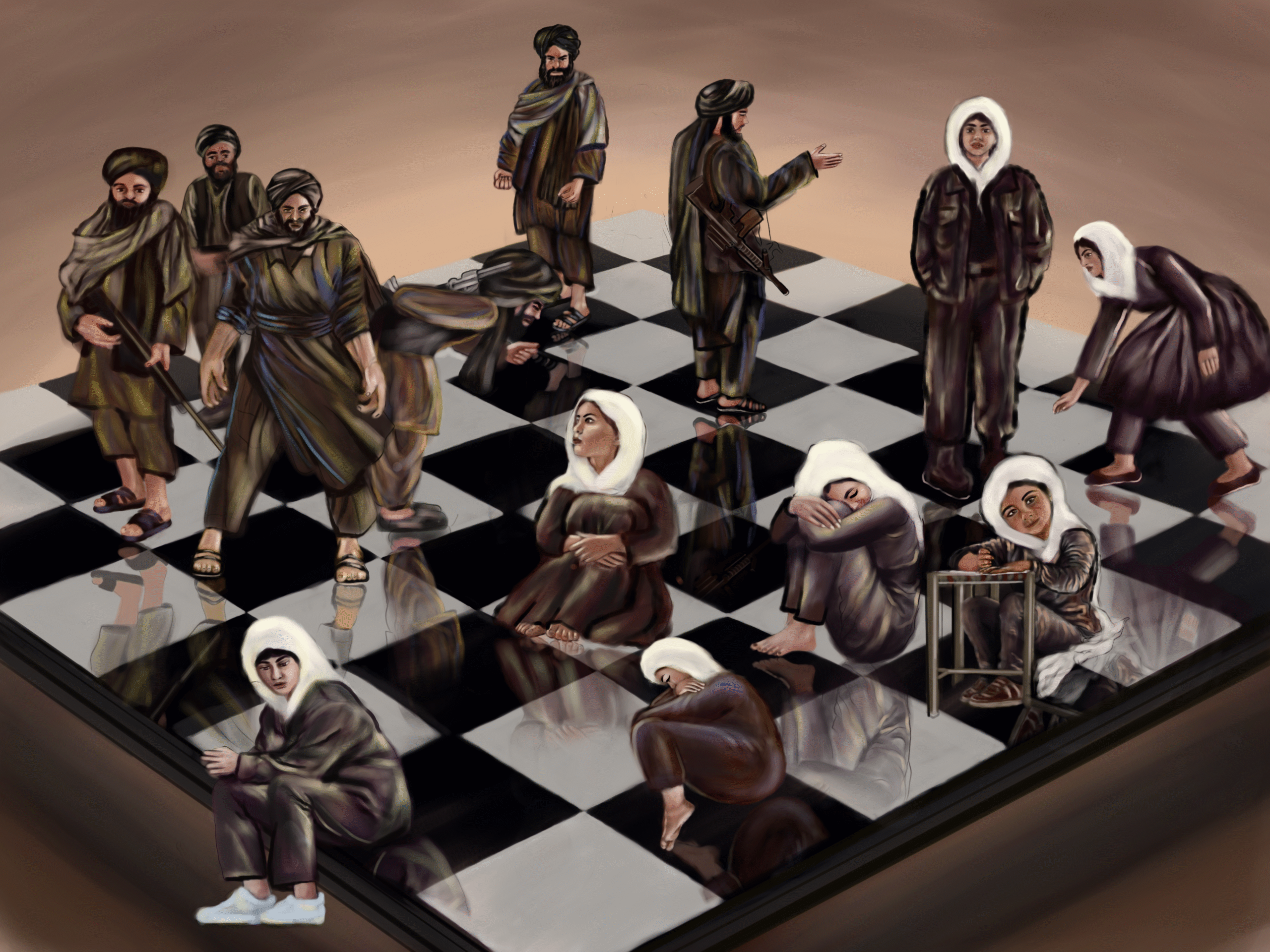 This artwork is a metaphor for a society where women and girls are treated like chess pieces in the game of power. Their sorrowful faces and downcast eyes reflect the oppression and restrictions that limit their freedom and agency. It reminds the viewer that human destiny should never be reduced to a pawn in political and violent agendas.