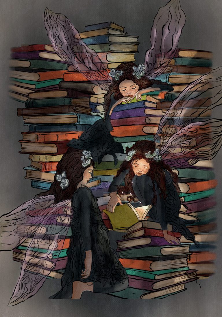 Girls seated on towering stacks of books, with wings of imagination on their backs, embody freedom of thought and spirit. Here, books are not only sources of knowledge but wings for escaping imposed limitations. The magical setting and muted tones highlight the contrast between harsh reality and bright ideals.